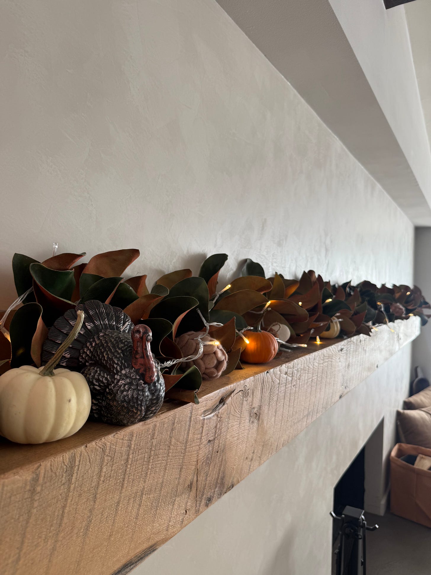 Nov 1: All things spooky come down from the house exterior except the pumpkins; they stay baking in the sun. Inside I pepper in bronze magnolia garlands and add twinkle lights IN the magnolia garland on the mantle and set it to a timer that I have to rebuy every year because I always forget where I put it. A fall wreath is ordered and it goes on the front door.
